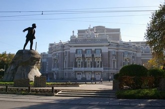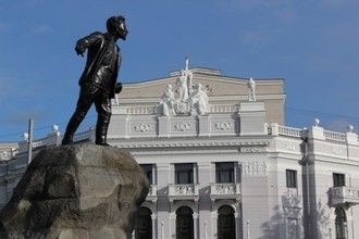 Монумент установлен в сквере напротив здания Театра оперы и балета. Авторами монумента стали скульптор М. Я. Харламов и архитектор С. В. Домбровский.
